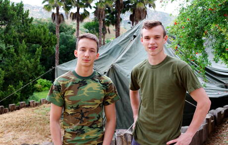 Active Duty: Der gut gebaute Amerikaner Scott Finn und der kräftige Liam Daniels ficken nach dem Schwanzlutschen im Freien