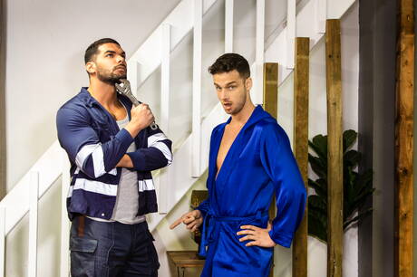 Men: Der belgische Kraftprotz Damon Heart und der brasilianische Schönling Lucas Fox ficken nach einem interracial Blowjob in den Arsch