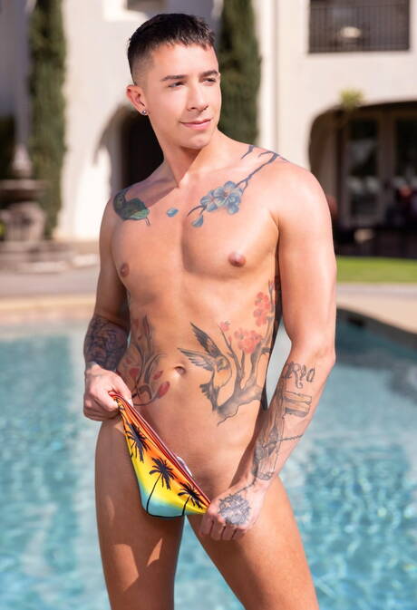 Falcon Studios: Der britische Muskelprotz Michael Boston und der amerikanische Superhengst Vincent Oreilly ziehen sich aus und zeigen ihren Hintern am Pool