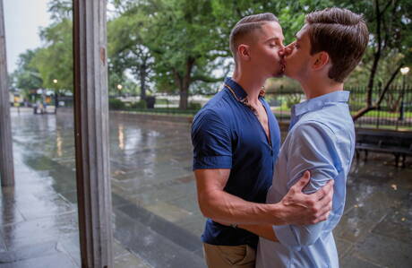 Falcon Studios: Der gut gebaute Kanadier Skyy Knox und der amerikanische Schönling Michael Delray haben eine heiße Pärchenszene in der Küche