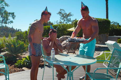 Next Door Studios: Die sportlichen Typen Roman Todd, Carter Woods und Des Irez feiern eine Geburtstagsparty im Garten und ficken dann im Doggystyle