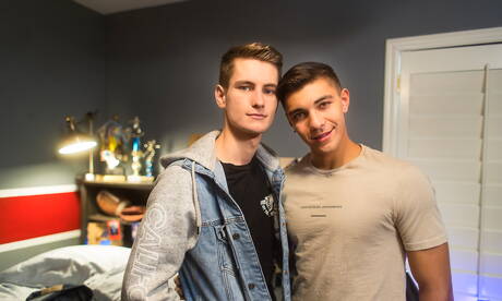Helix Studios: Guapos estadounidenses, el guapo Alex Riley y el jovencito Trevor Harris en sexo anal duro