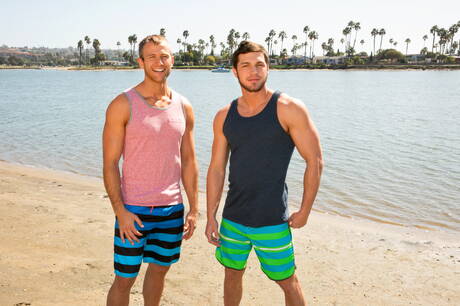 Sean Cody: Le beau mec américain Brandon Cody et le costaud Blake baisent le cul après avoir sucé une bite après une promenade sur la plage