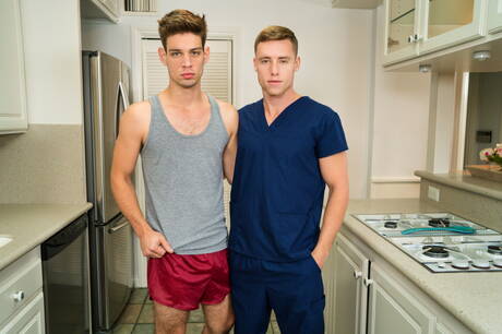 Men: Les stars du porno américaines Michael Delray et Justin Matthews, costauds, baisent le cul après avoir sucé une bite dans la cuisine