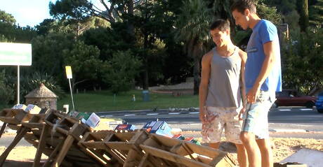 Belami Online: Les beaux mecs tchèques Gino Mosca et Gaelan Binoche baisent le cul après avoir sucé une bite en extérieur