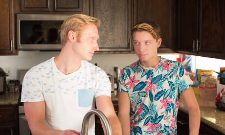Helix Studios: Les sympathiques copains américains, le jeune Jacob Hansen et le beau mec Max Carter dans une scène de fessée dans la cuisine