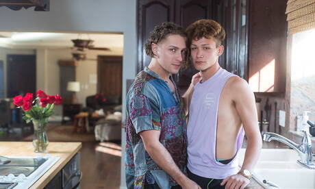 Helix Studios: Les beaux mecs américains Calvin Banks et le minet Hayden Lee baisent le cul après une pipe dans la cuisine