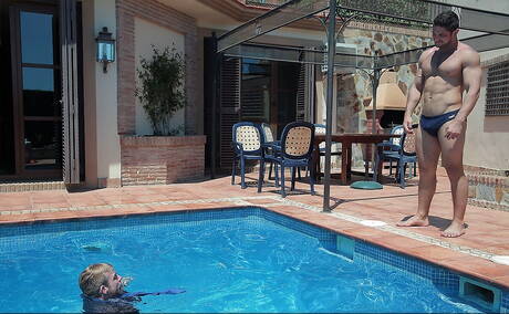 Men At Play: Le beau gosse russe Dato Foland et l'étalon poilu anglais Gabriel Phoenix baisent le cul après une pipe à la piscine
