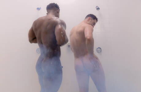 American strongman Tristan Hunter and hunky guy Isaiah Taye in black on white love in shower