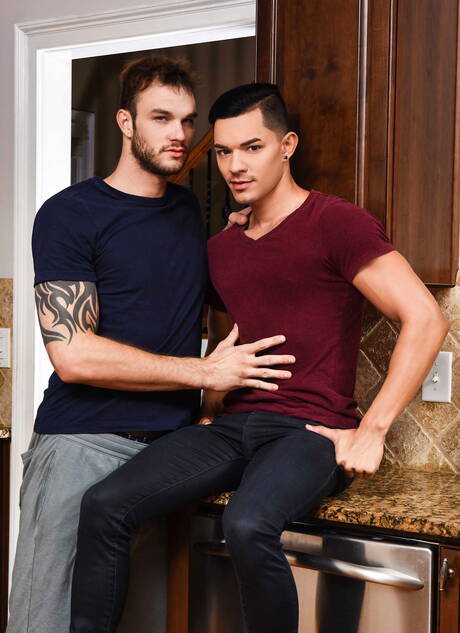 Beefcake Ethan and american husky guy Cliff Jensen fuck ass after sucking dick in the kitchen