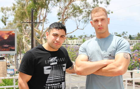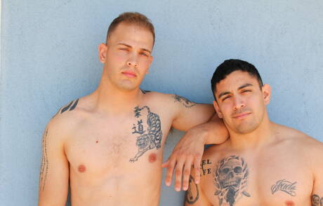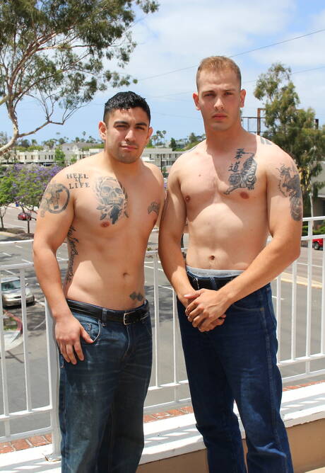 Beefy Chase and strongman Flip sucking and fucking each other outside