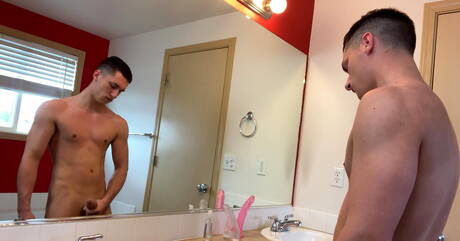 Hunk Misha Krocks and hunk Brandon Tam in blowjob scene in bathroom