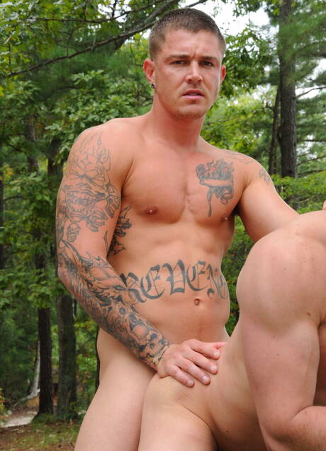 Hunk Sam Barclay and superstud Rowen Bailey fuck ass after blowjob outdoor