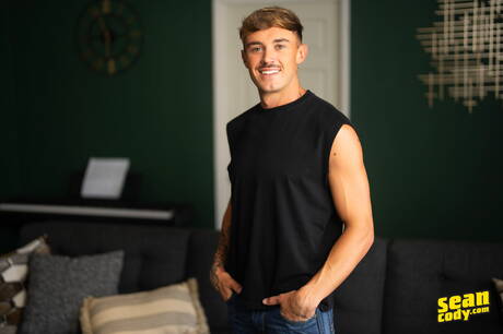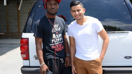 Muscular Danny Enriquez and beefcake Phoenix in black on white anal sex outside