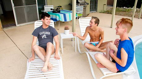Nasty buddies Chase Young, Luke Allen and Kyler Ash have a hot threesome sex at the pool