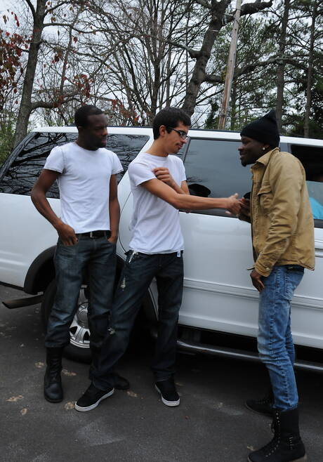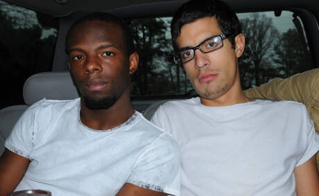 Sexy guys Intrigue, Nate Richards and Pleasure Boi in hard interracial 3some sex outside