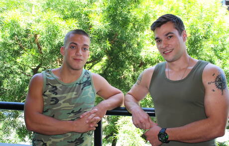 Active Duty: American muscular Princeton Price and well-built Scotty Dickenson in hot homosexual scene outside