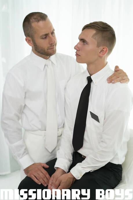 Missionary Boys: American pornstars twink Darron Bluu and mature bear Joel Someone in cock sucking scene