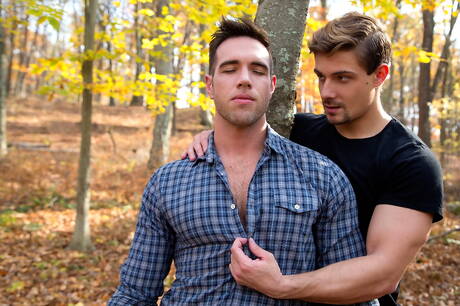 Cocky Boys: American superstud Alex Mecum and canadian tough guy Carter Dane banged each other outdoor