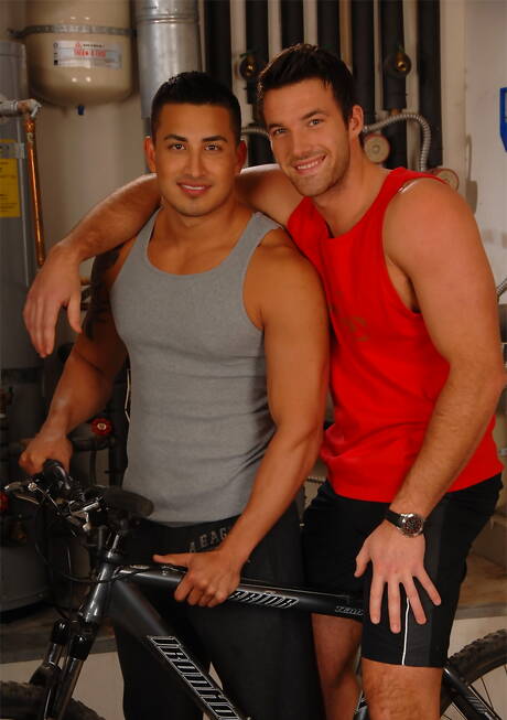 Next Door Studios: Canadian beefcake Trystan Bull and latin beefy Hunter Vance in cock sucking scene