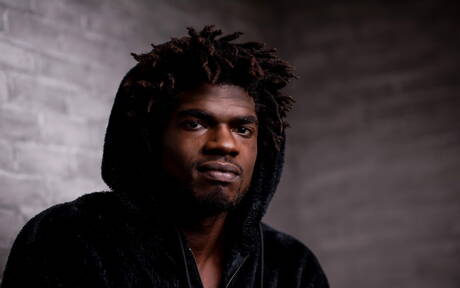 Noir Male: Ebony beefy Devin Trez shows a muscle body