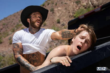 Men: Husky guy Sage Roux and beefy Joel Hart have a hot couple scene outside