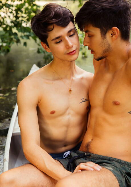 Cocky Boys: Latino pretty boy Angel Rivera and hunky guy Leo Grand have a good oral sex outside