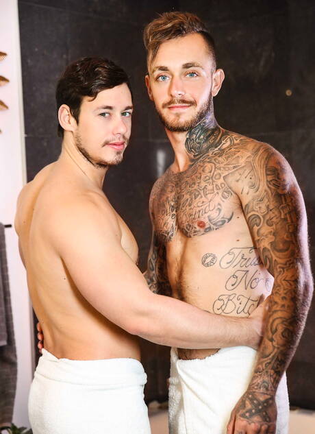 Men: Nice american boys muscular Brian Michaels and stud Tobias have a good anal sex in bathroom