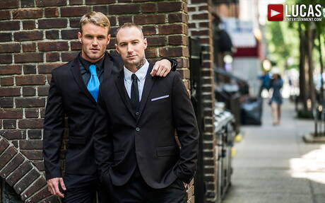 Lucas Entertainment: Pretty american boys well-built Dylan James and beefcake Shawn Reeve fuck ass after blowjob outside