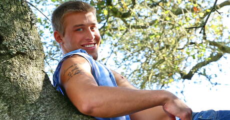 Next Door Studios: Il muscoloso americano Austin Storm stuzzica il suo cazzo all'aperto