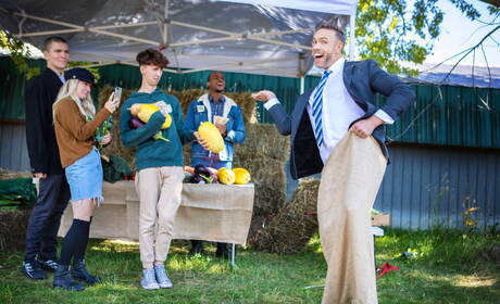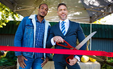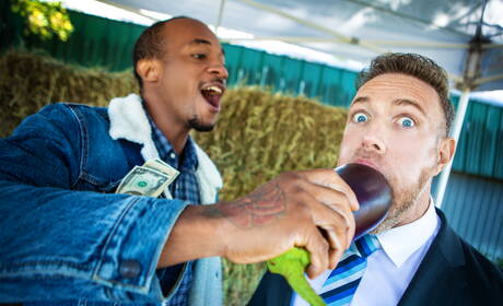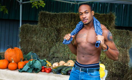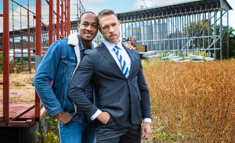 Men: American well-built Alex Mecum and black muscular Trent King in hard interracial anal sex outside