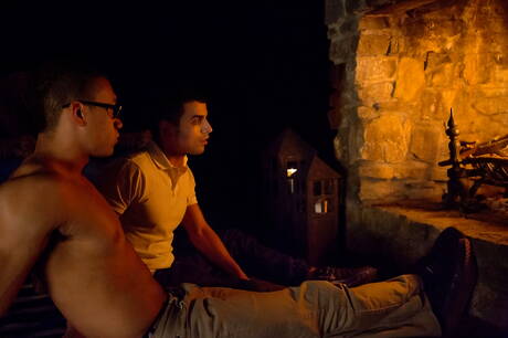 Cocky Boys: Attractive dude Jay Mercer and hot guy Junior Fernandez in hot interracial anal sex outside