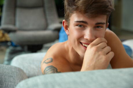 Freshmen: Beefy Alan Cartier posing nude and showing tight butt outside