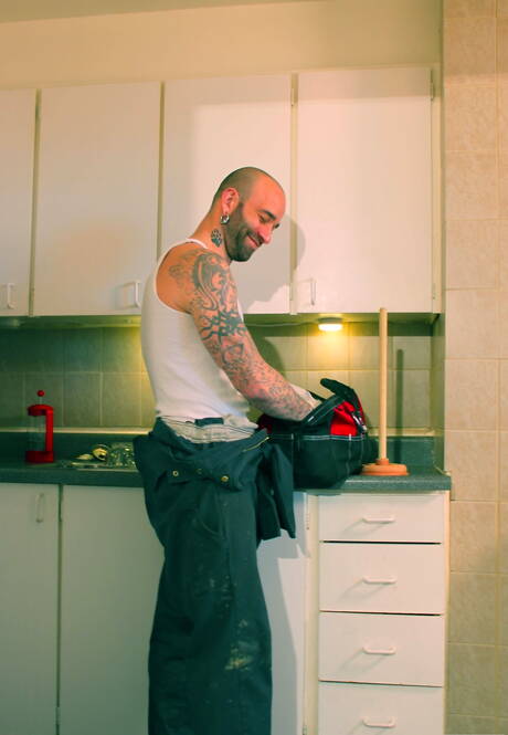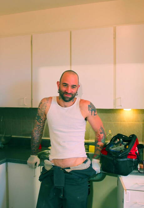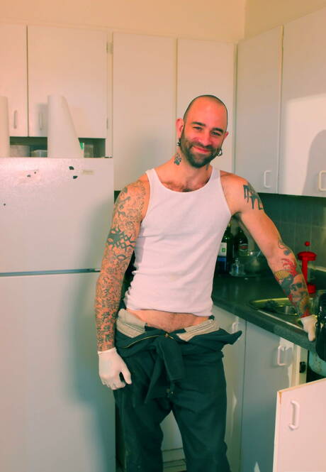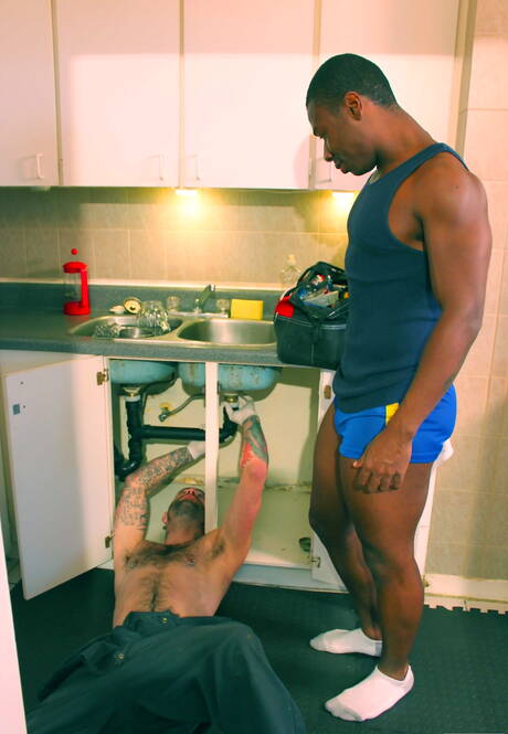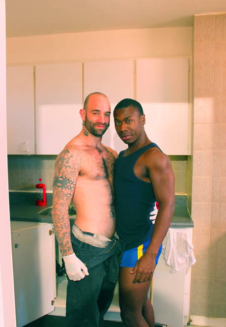 Next Door Studios: Canadian mature bear Sam Swift and black beefcake Damian Brooks in hard interracial anal sex in the kitchen