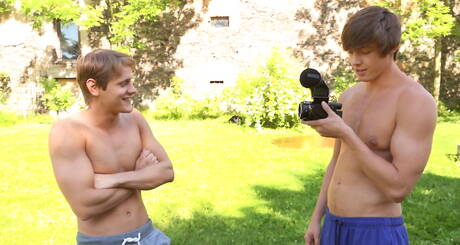 Belami Online: Czech beefcake Helmut Huxley and slovak beefcake Eluan Jeunet playing with cock outdoor