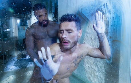 Falcon Studios: English hunky guy Josh Moore and Reign have a hot interracial sex in bathroom
