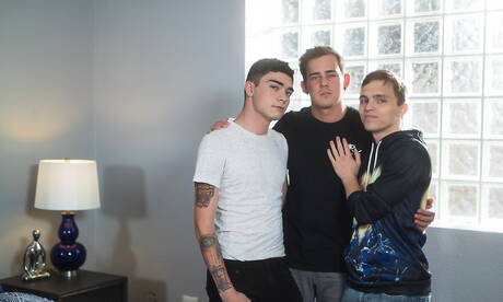 Helix Studios: Hot buddies Josh Brady, Tristan Adler and Ashtin Bates have threesome anal sex