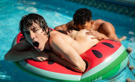 Men: Latino strong bull Kenzo Alvarez and american young Cristiano have a good sex at pool