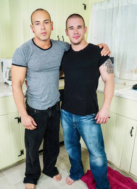 Men: Leon Lewis and american hunky guy Adam Bryant fuck ass after sucking dick in the kitchen