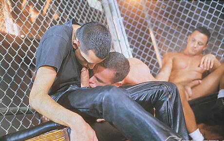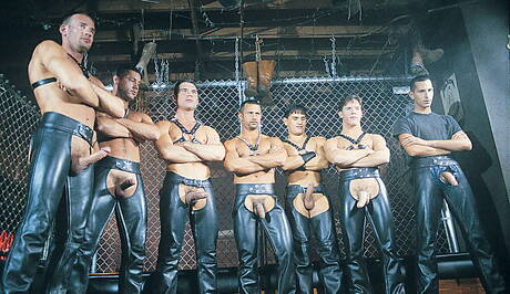 Falcon Studios: Nick Riley, Chad Kennedy, Cameron Fox, Virgil Sainclair, Chip Noll in leatcher cloths have a hoy gay orgy