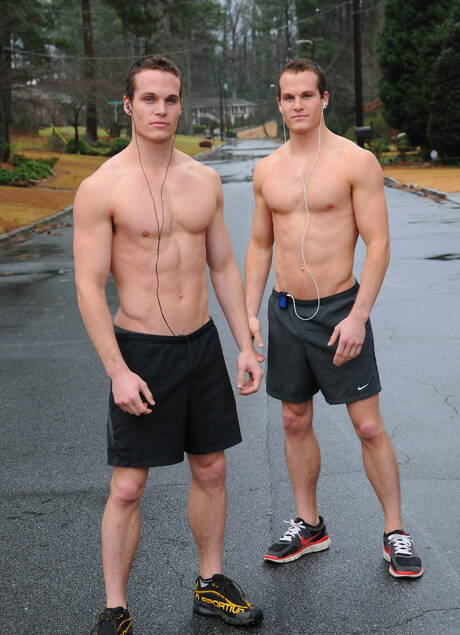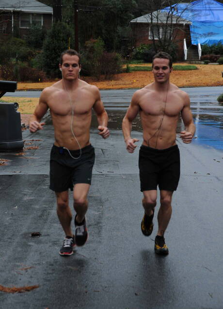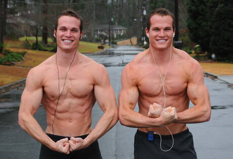 Men: Strongman Casey and american beefcake Luca Rosso love each other outside
