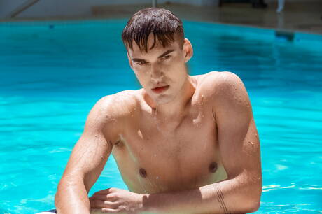 Freshmen: Strongman Virgil Avedon undressing and showing hot butt at the pool