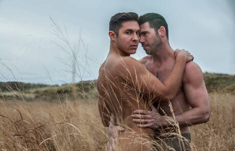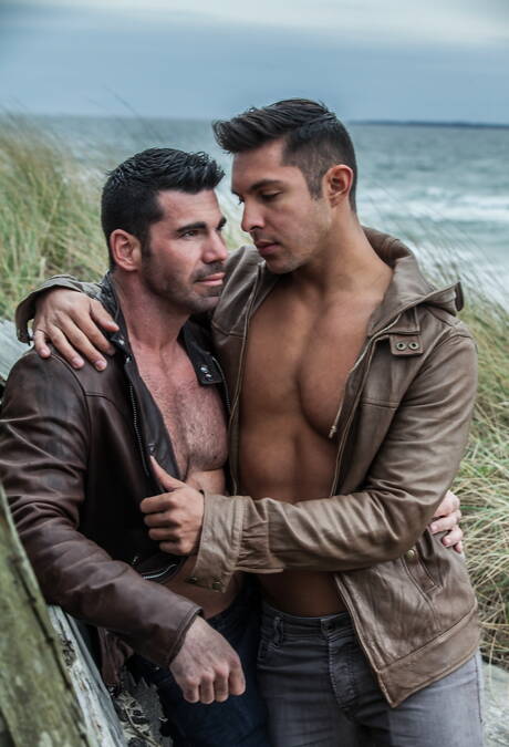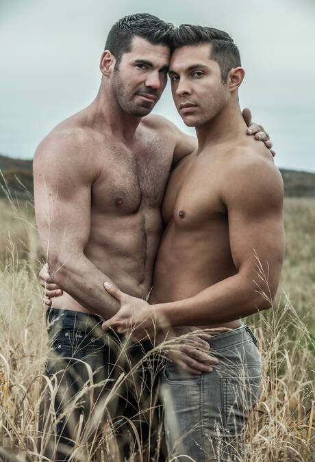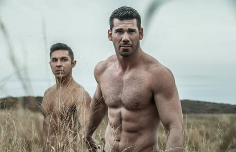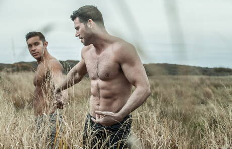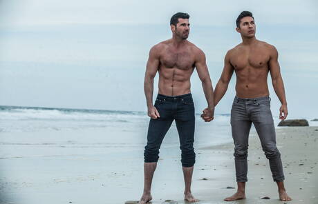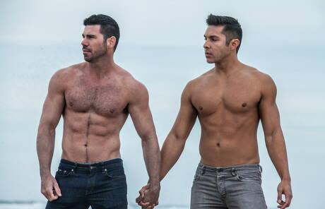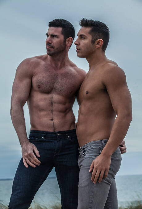 Icon Male: Two american guys muscular Billy Santoro and bodybuilder Seth Santoro shows a muscle body on beach