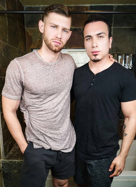 Men: Amerikaanse otter Jacob Peterson en superstud Izaak Aziz neuken elkaar na een pijpbeurt in de badkamer
