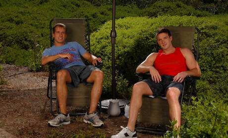 Next Door Studios: De goed gebouwde Canadese Trystan Bull en de Amerikaanse sterke man Brandon Lewis hebben een goede orale seks in de buitenlucht