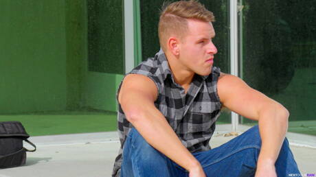 Next Door Studios: Caras americanos gostosos e fortes, Shane Cook e Andrew Miller, lontra, em sexo anal quente ao ar livre