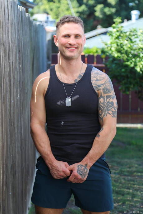 Active Duty: 性感的美國健美運動員布萊恩·奧康納和強壯的公牛德里克·凱奇在戶外拍攝火辣的同性戀場景