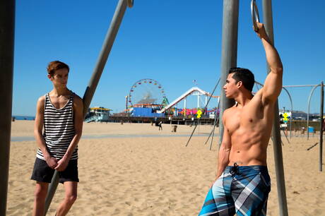 Cocky Boys: 年輕小伙子科迪·斯圖爾特和拉丁硬漢托弗·迪馬吉奧在沙灘上做愛
